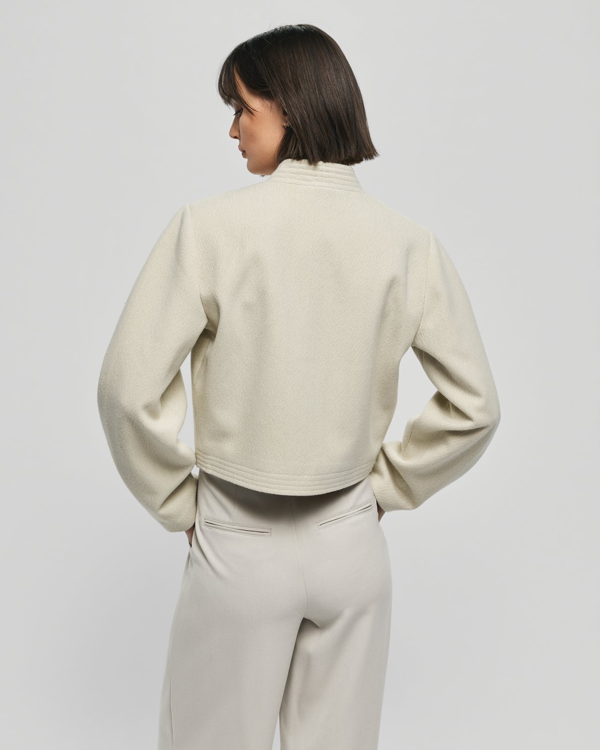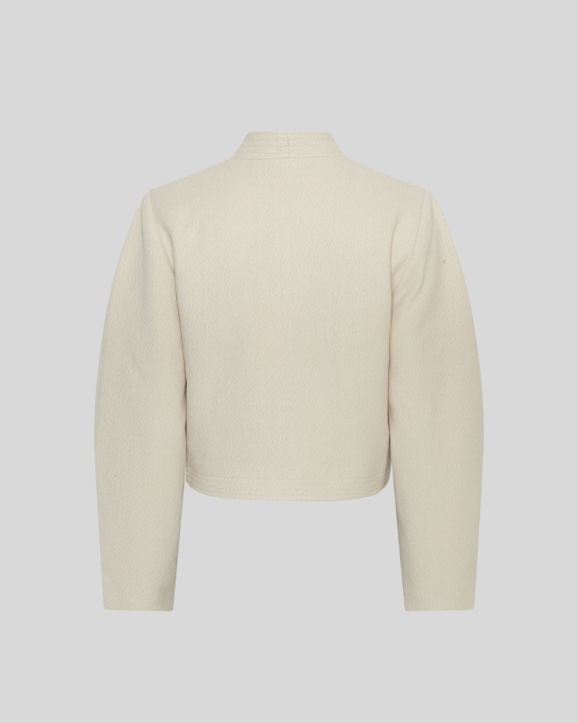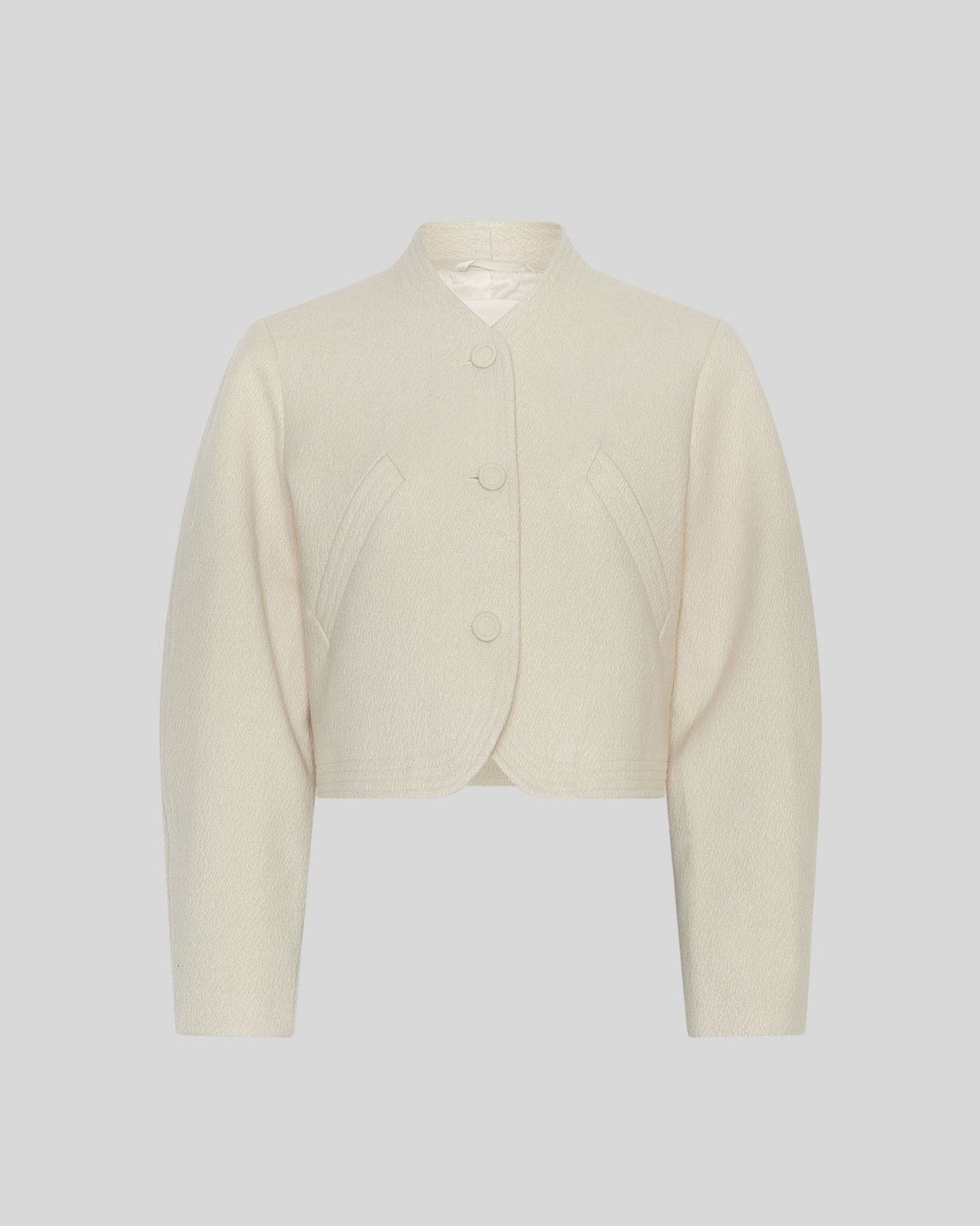 Kurze Jacke mit Rundhalsausschnitt und Knopfleiste. Langarm und mit dezenten Fronttaschen.