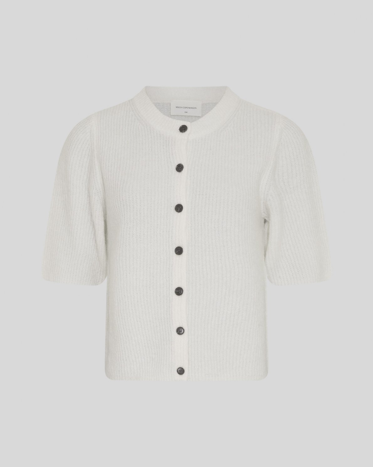 Gestrickte Strickjacke mit Rundhalsausschnitt und durchgehender Knopfleiste. Kurze Ärmel und eine fein strukturierte Strickqualität mit Rippabschlüssen.