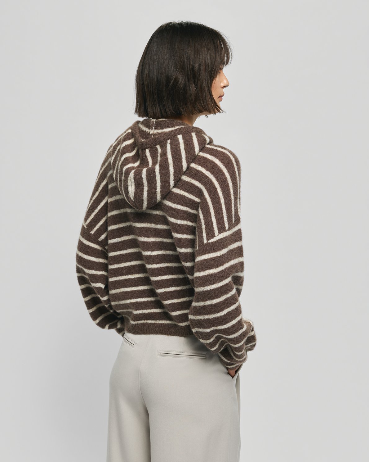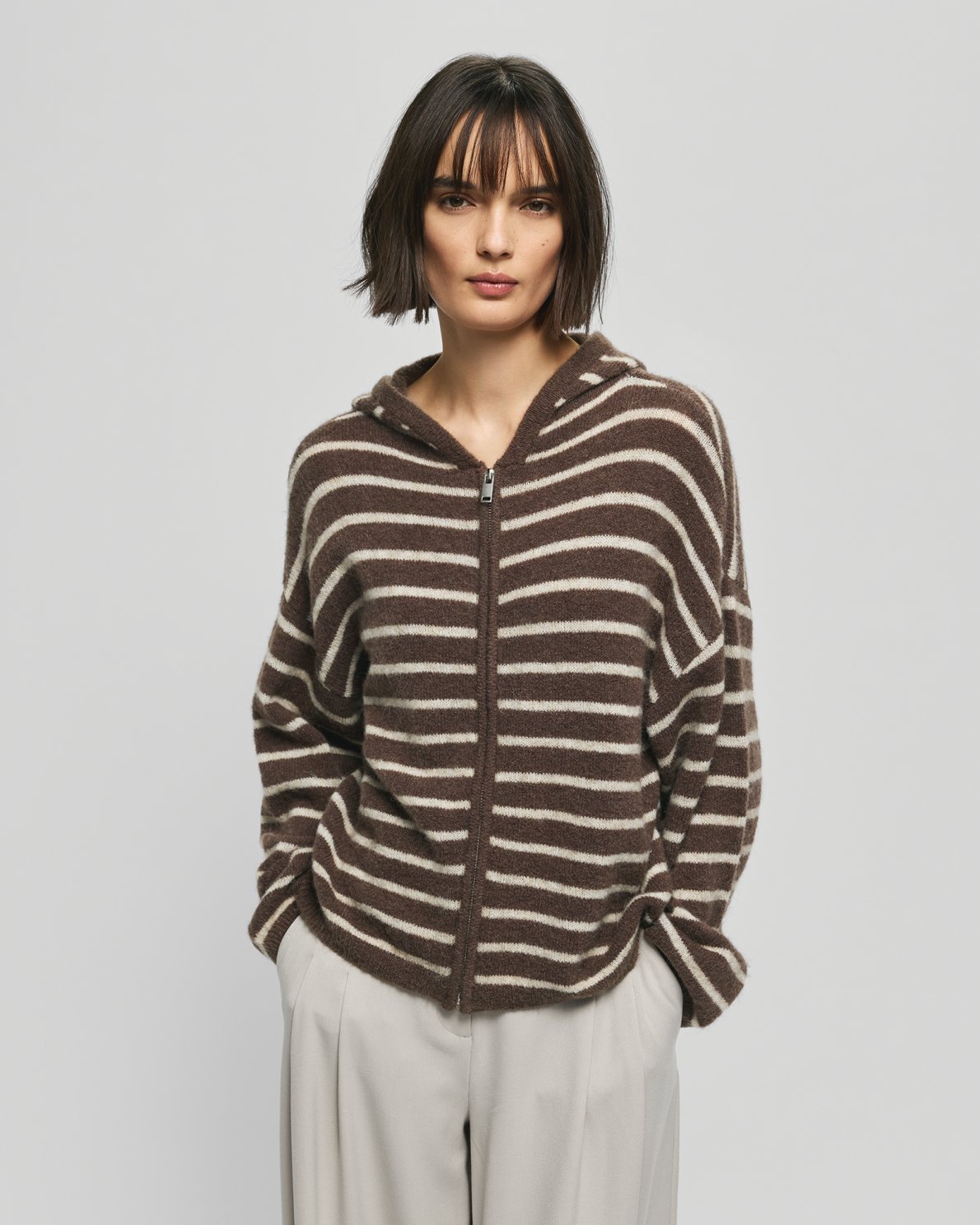 Gestrickte Strickjacke mit horizontalen Streifen und Reißverschluss. Mit Kapuze und Langarm sowie überschnittenen Schultern.