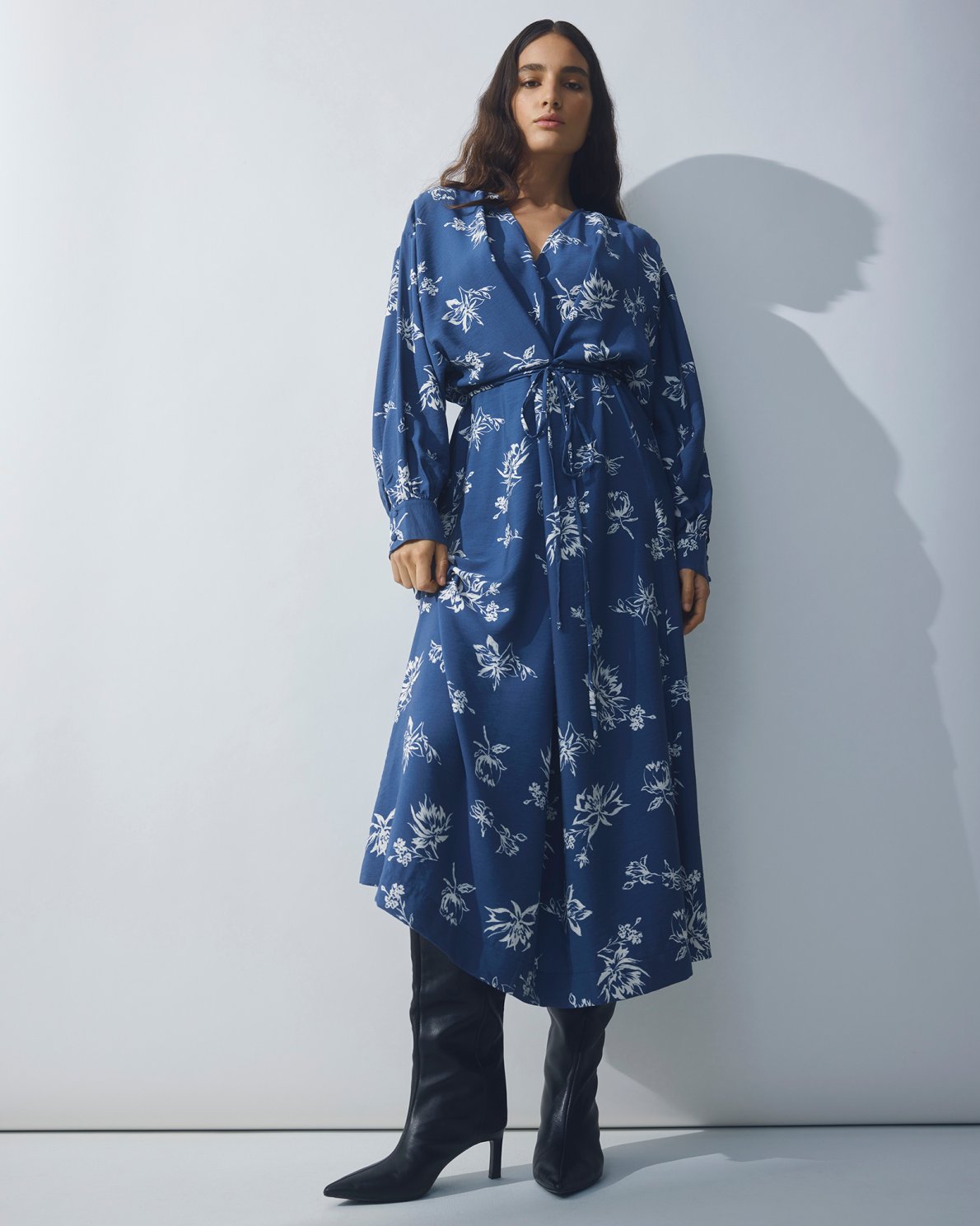 Langes Kleid mit Allover-Print. Mit V-Ausschnitt, durchgehender Knopfleiste und Bindeband in der Taille. Lange Ärmel mit Manschetten. Leicht ausgestellter Rock.