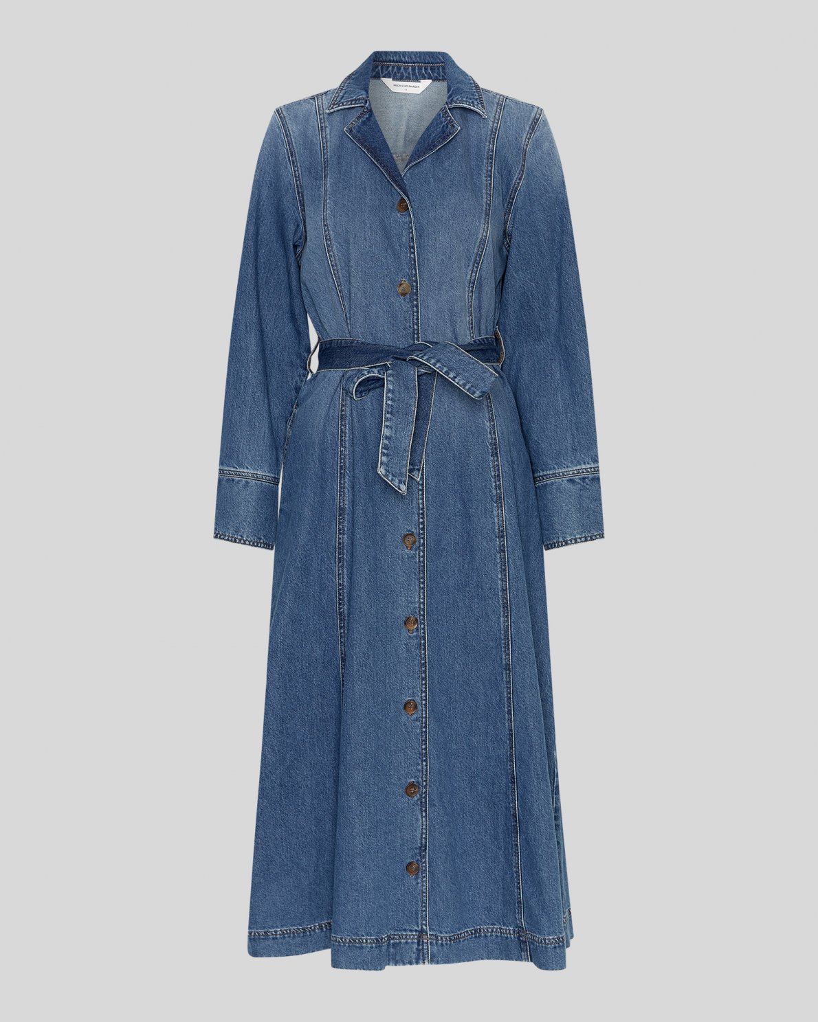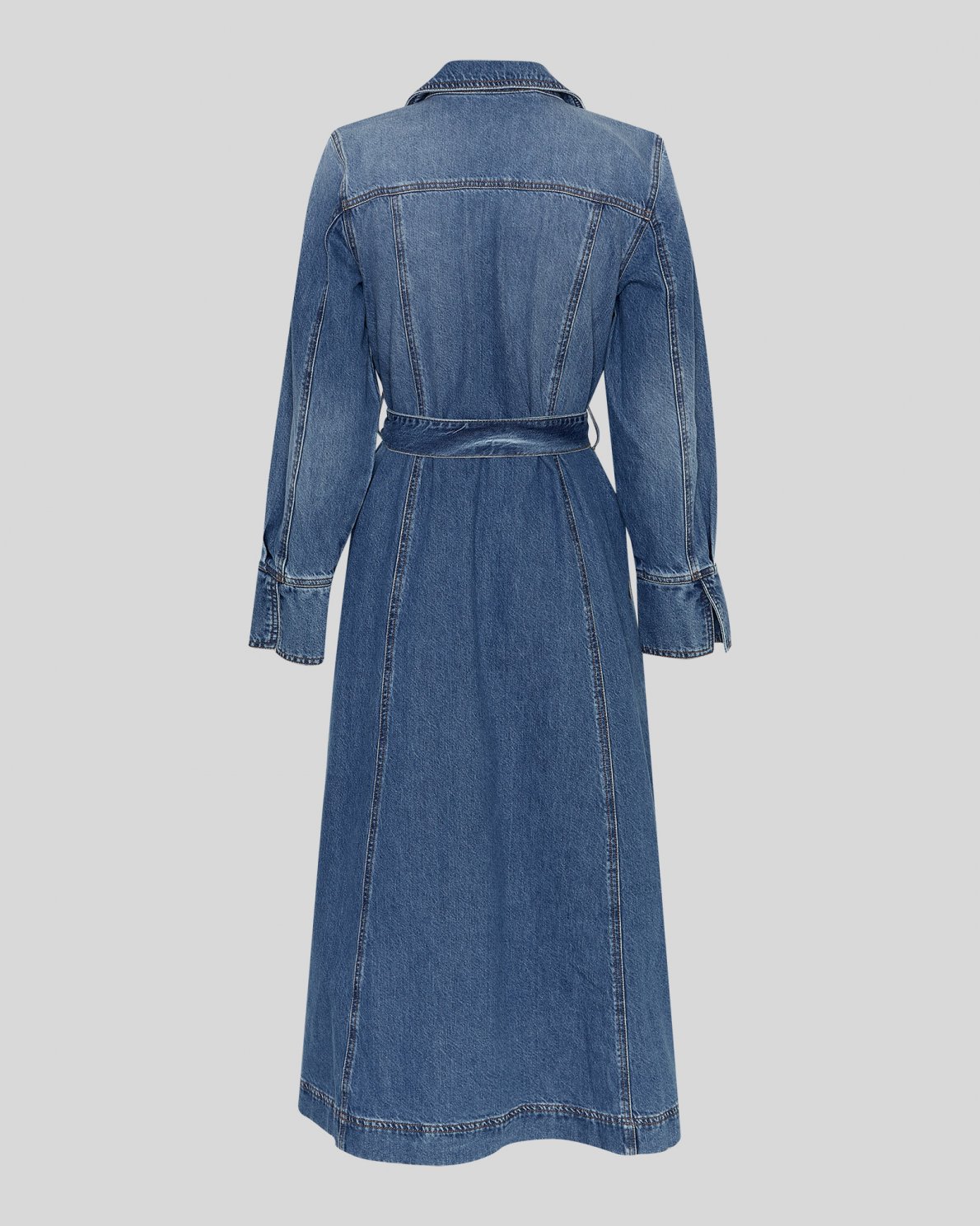 Dieses lange Denim-Hemdkleid überzeugt mit einem zeitlosen Design und einer femininen Silhouette. Es ist mit Kragen, durchgehender Knopfleiste und langen Ärmeln mit Manschetten gestaltet. Der Bindegürtel betont die Taille und ermöglicht eine individuelle Passform. Ein vielseitiges Denim-Kleid für Alltag und besondere Anlässe.