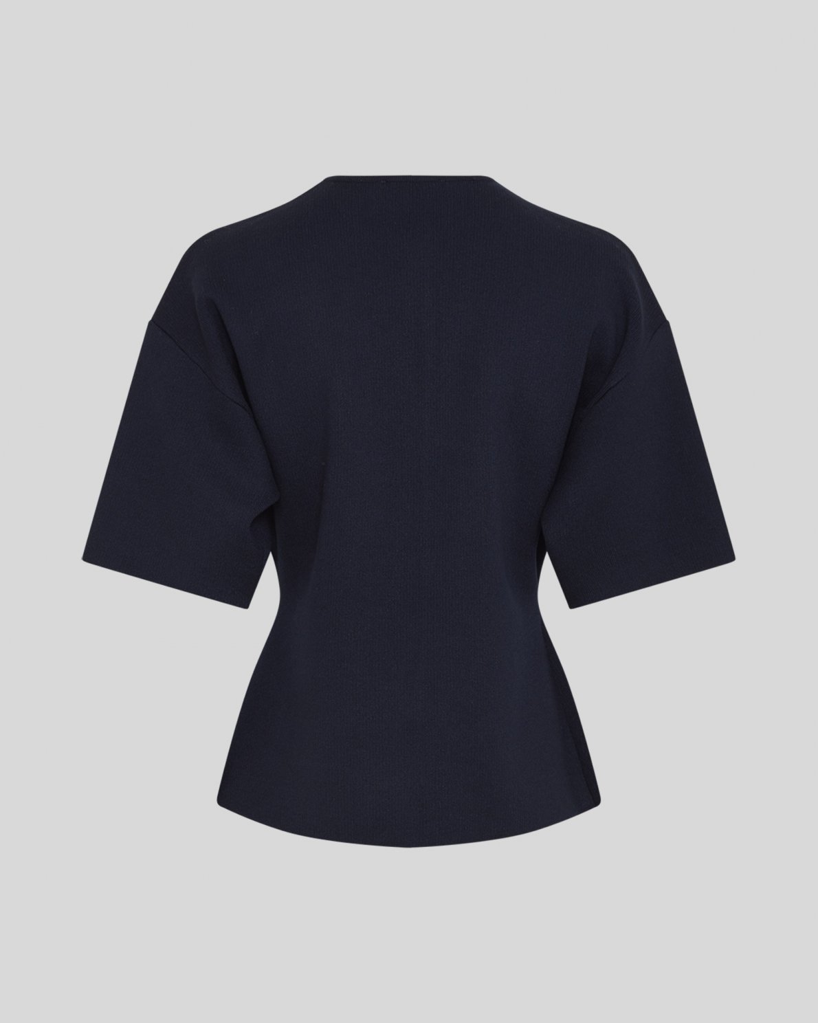 Kurzärmelige Strickjacke mit figurbetonter Silhouette und Rundhalsausschnitt. Mit durchgehender Knopfleiste vorne und gerippter Struktur. Körpernahe Passform.
