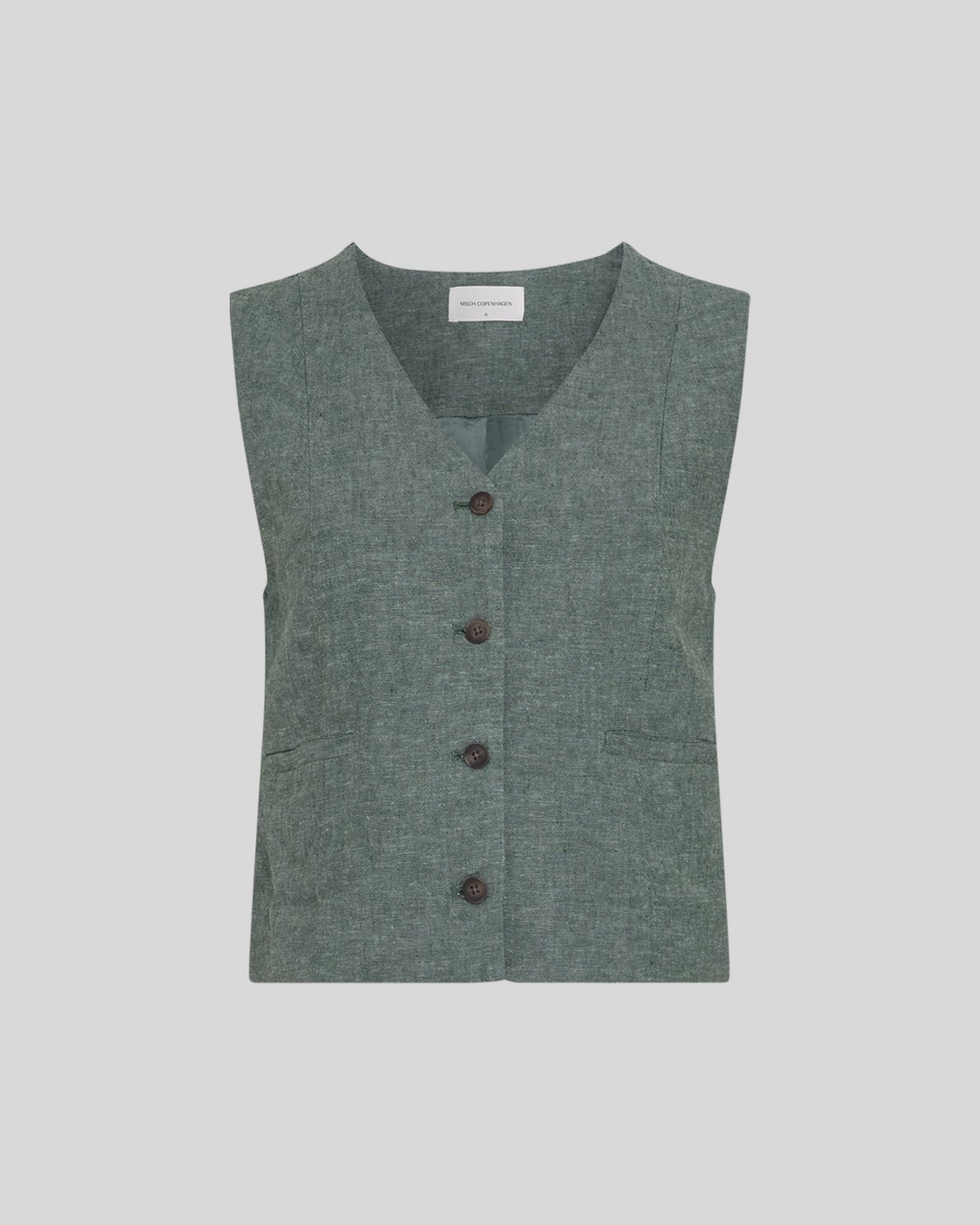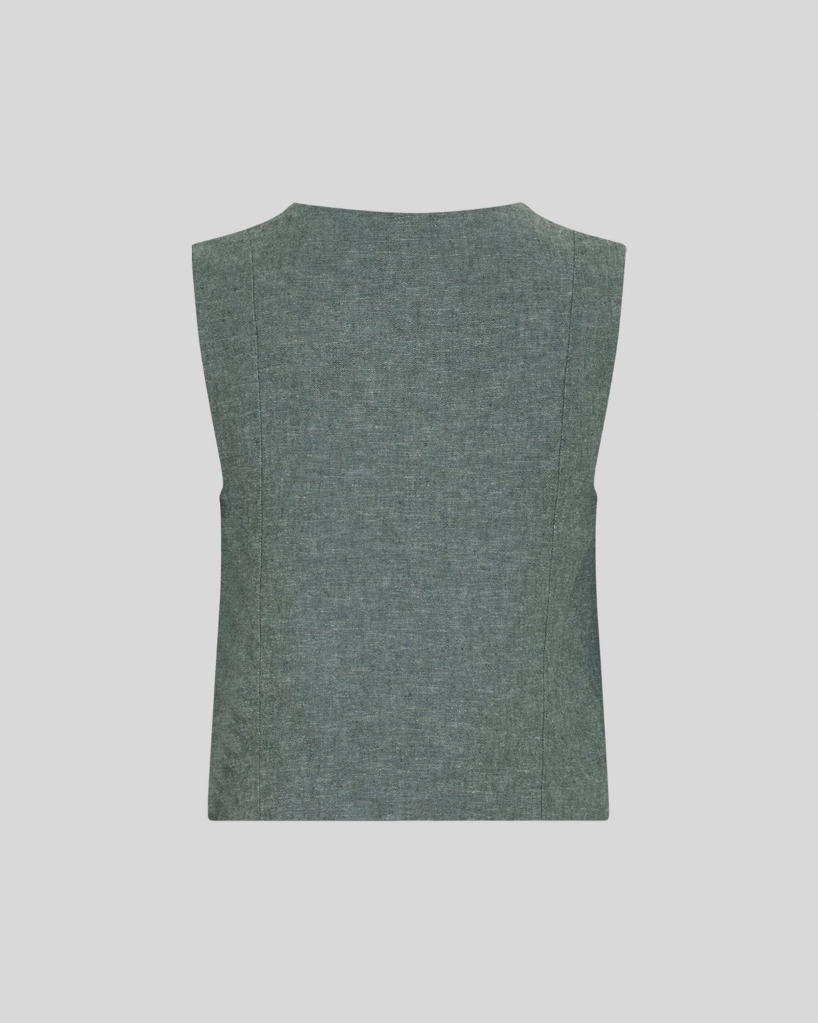 Ärmellose Weste aus Leinenmischung. Mit leicht lockerer Passform und V-Ausschnitt. Knopfverschluss auf der Vorderseite und zwei dekorative Taschen. Vollständig gefüttert.