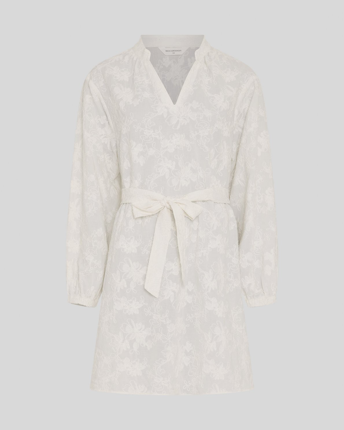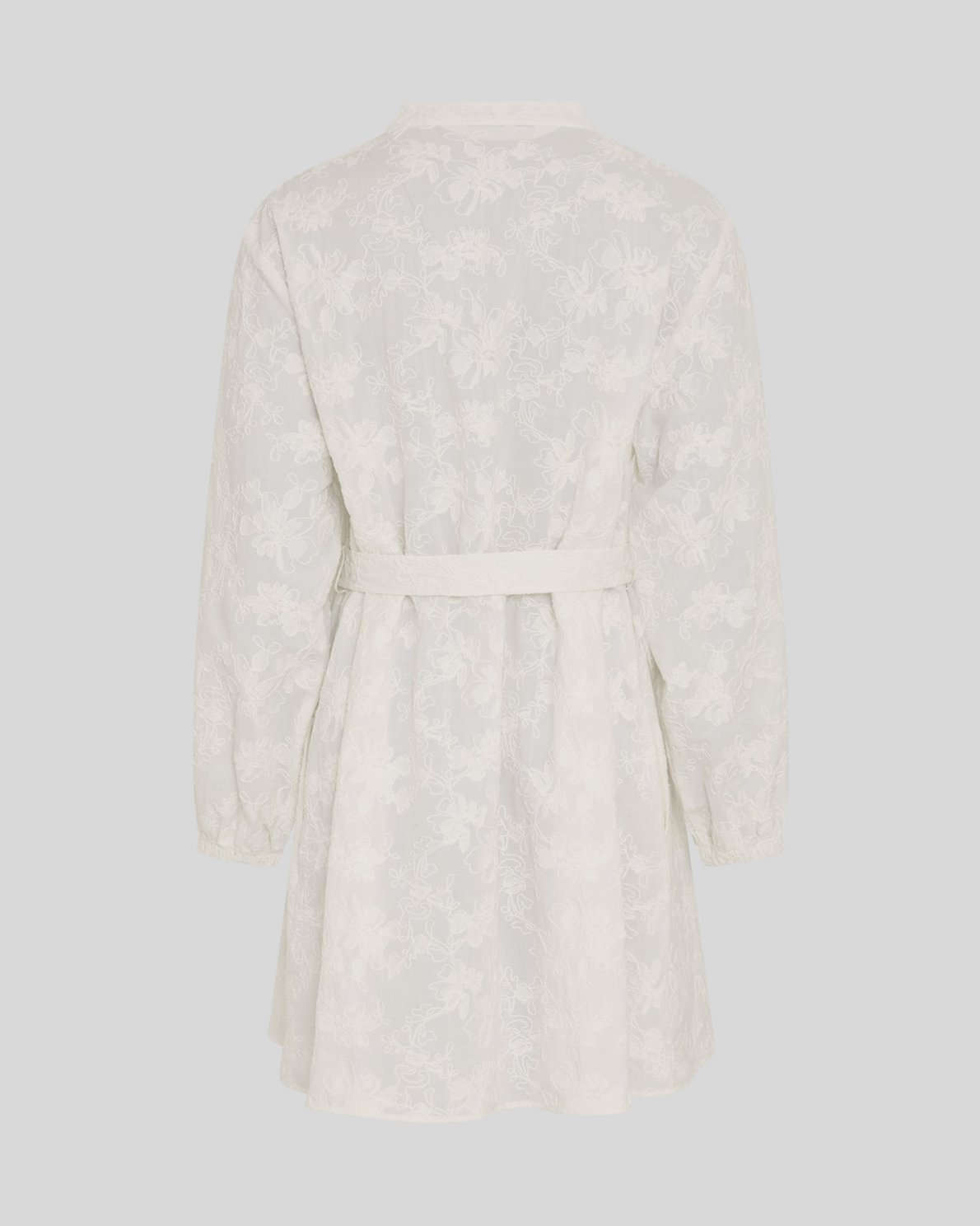 Gewebtes Kleid mit gestickter Blumenstruktur. Mit V-Ausschnitt, langen Ärmeln mit elastischem Abschluss und Bindegürtel in der Taille. Normale Passform.
