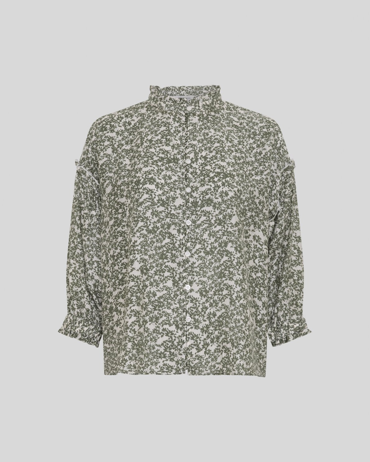 Blusen aus leichter Webqualität mit Allover-Blumenprint. Mit Stehkragen mit feiner Rüsche, durchgehender Knopfleiste und 3/4-Ärmeln mit elastischem Rüschenabschluss. Normale Passform.
