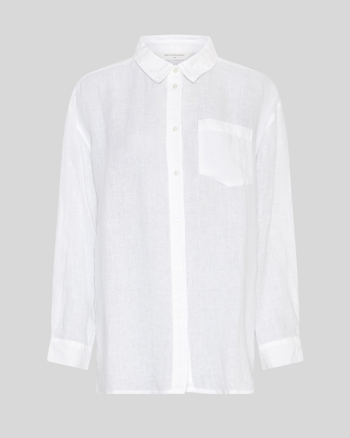 Langes Blusen aus 100% Leinen mit leichter und atmungsaktiver Struktur. Mit klassischem Hemdkragen und durchgehender Knopfleiste vorne. Lange Ärmel mit Manschette und Knopfverschluss. Aufgesetzte Brusttasche und leicht gerundeter Saum. Lockere Silhouette mit verlängerter Länge.