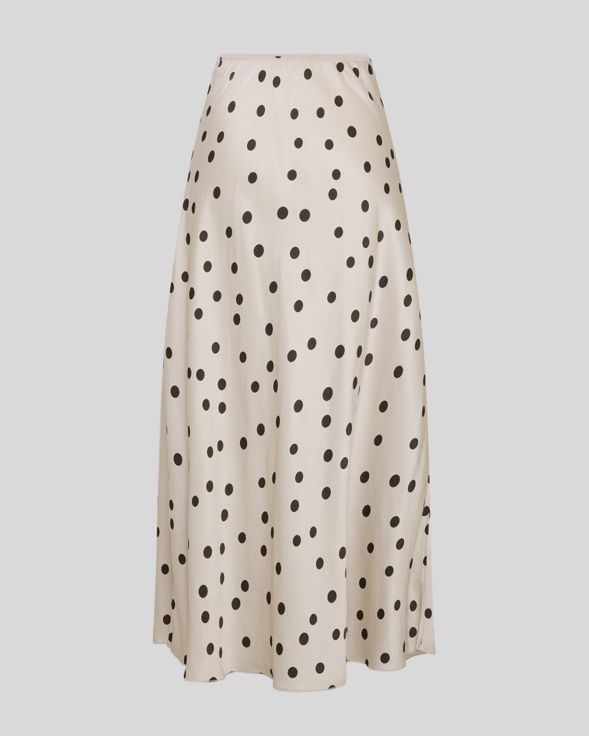 Langer Rock mit Allover-Punktmuster. Leichte, fließende Qualität mit glatter Oberfläche. Elastischer Bund und A-Linien-Silhouette mit natürlichem Fall.
