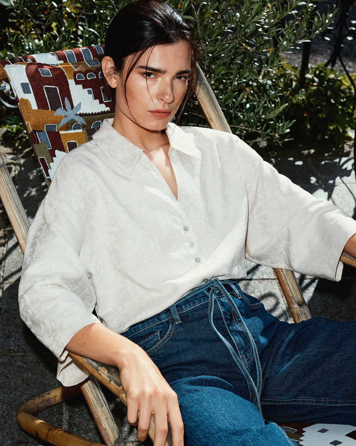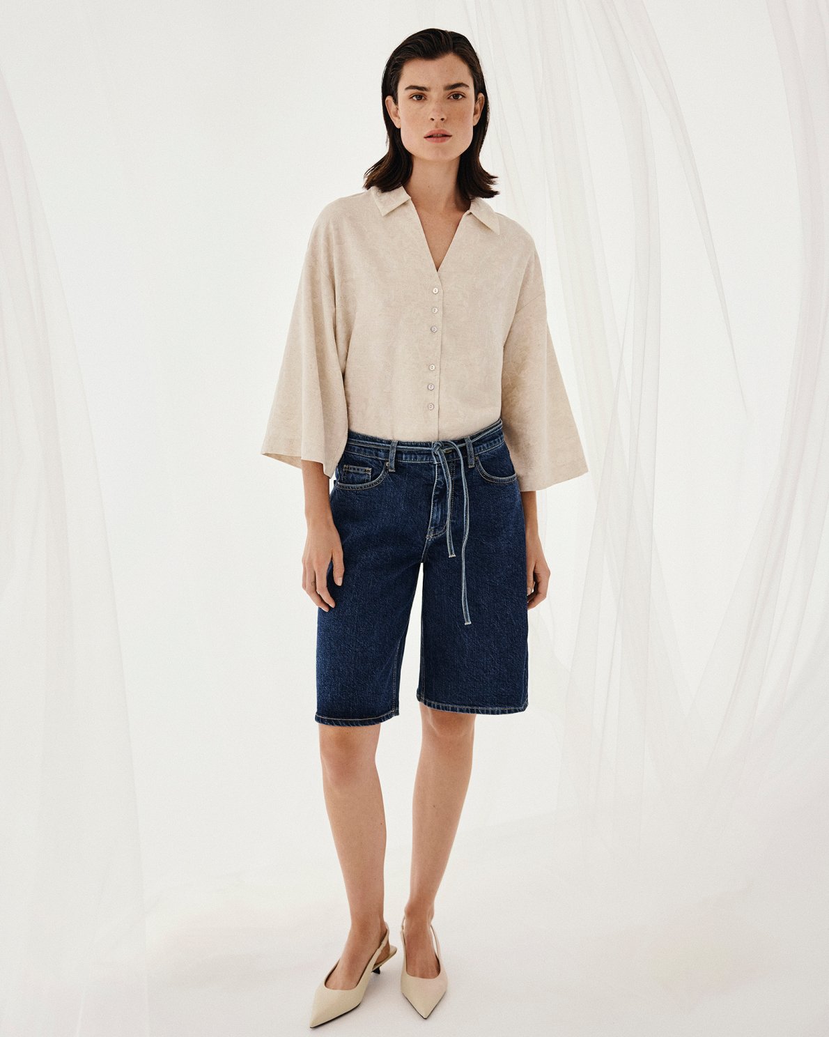 Blusen in strukturierter Qualität mit tonalem Jacquardmuster. Mit klassischem Hemdkragen und durchgehender Knopfleiste vorne. 3/4 Ärmel mit weiter Form. Abnehmbarer Taillengürtel für verstellbare Passform. Leicht A-förmige Silhouette.